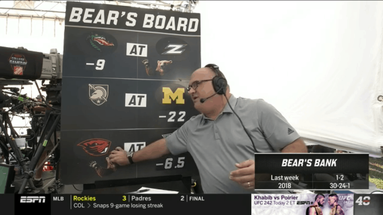 College Football | Football Chris Fallica Bear’s Bank Week 2 2019 Picks On ESPN College Gameday #SaturdaySelections ByGeorge September 7, 2019September 7, 2019 Here are the Bear’s picks for today… UAB at Akron – Akron (+9) Oregon St at Hawaii – Oregon St (+6.5) Army at Michigan – Michigan (-22) Pages: 1 2