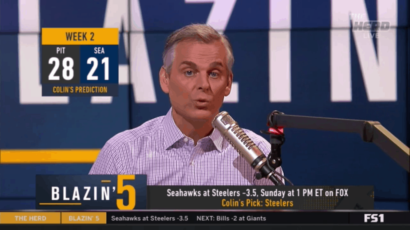Football | NFL Colin Cowherd Blazing Five NFL 2019 Week 2 Picks On Fox Sports ByGeorge September 15, 2019September 15, 2019 Seattle at Pittsburgh – Pittsburgh (-3.5) More picks next page… Pages: 1 2 3 4 5 6