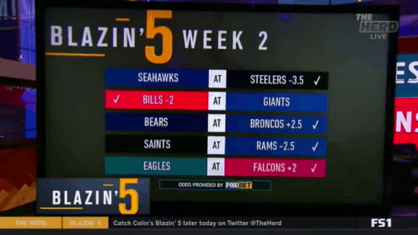 And here’s a summary of all the Blazing Five Picks for Week 2 of the 2019 NFL Season