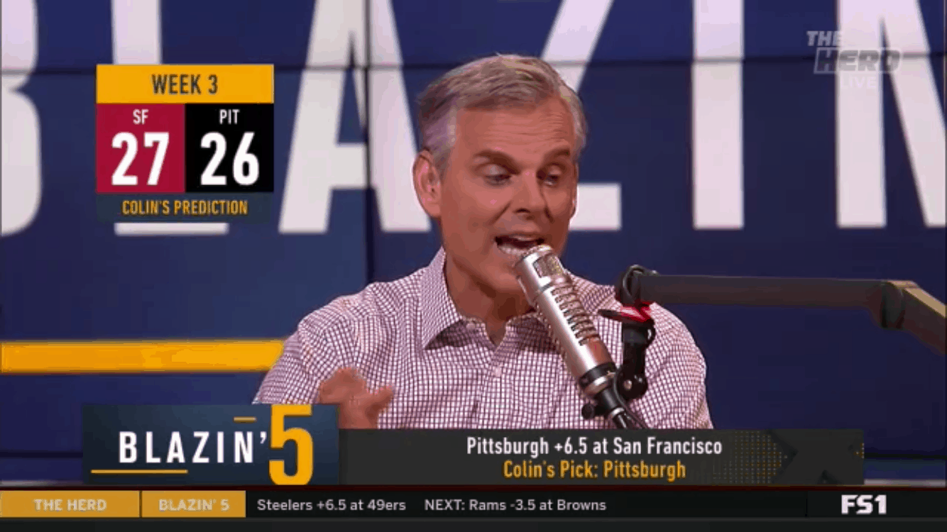 Football | NFL Colin Cowherd Blazing Five NFL 2019 Week 3 Picks On Fox Sports ByGeorge September 21, 2019September 21, 2019 Pittsburgh at San Francisco – Pittsburgh (+6.5) More picks next page… Pages: 1 2 3 4 5 6