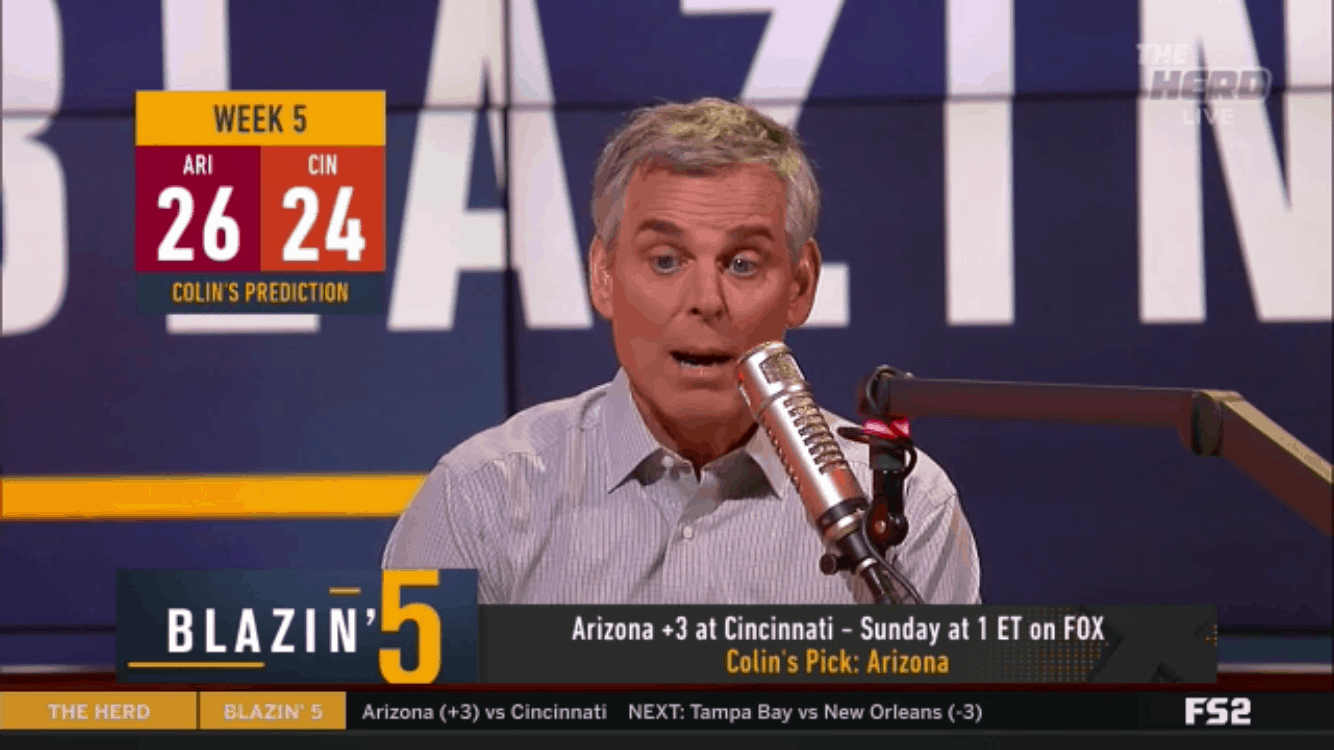 Football | NFL Colin Cowherd Blazing Five NFL 2019 Week 5 Picks On Fox Sports ByGeorge October 5, 2019October 5, 2019 Arizona at Cincinnati – Arizona (+3) More picks next page… Pages: 1 2 3 4 5 6