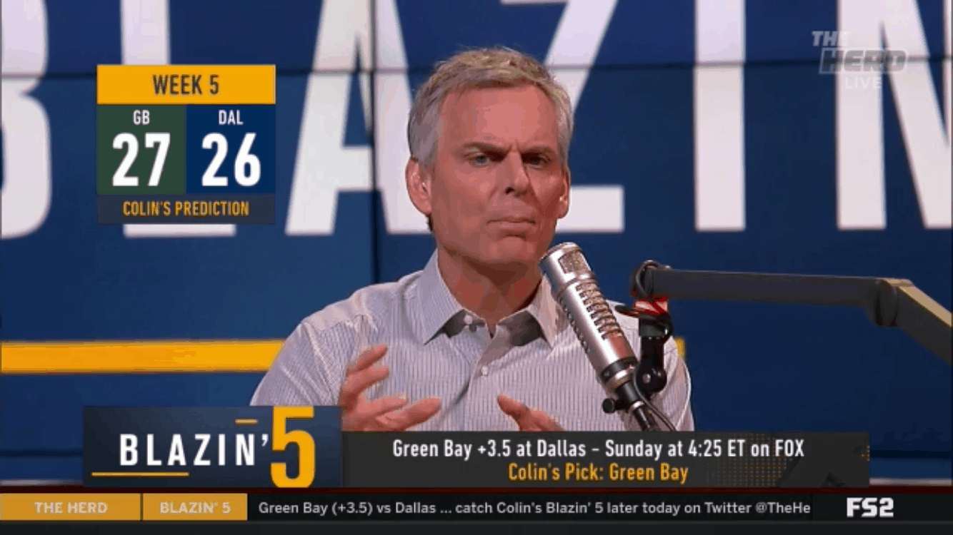 Football | NFL Colin Cowherd Blazing Five NFL 2019 Week 5 Picks On Fox Sports ByGeorge October 5, 2019October 5, 2019 Green Bay at Dallas – Green Bay (+3.5) Summary next page… Pages: 1 2 3 4 5 6