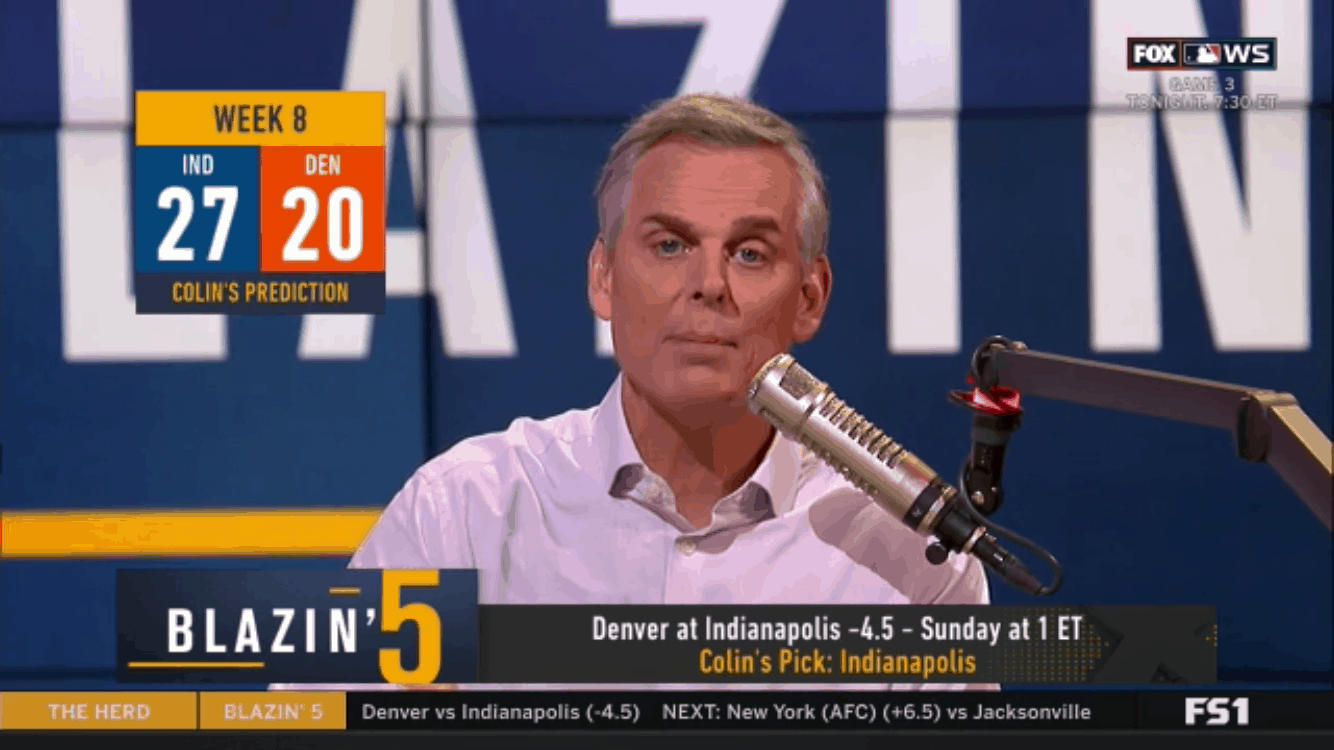 Football | NFL Colin Cowherd Blazing Five NFL 2019 Week 8 Picks On Fox Sports ByGeorge October 26, 2019October 26, 2019 Denver at Indianapolis – Indianapolis (-5) More picks next page… Pages: 1 2 3 4 5 6