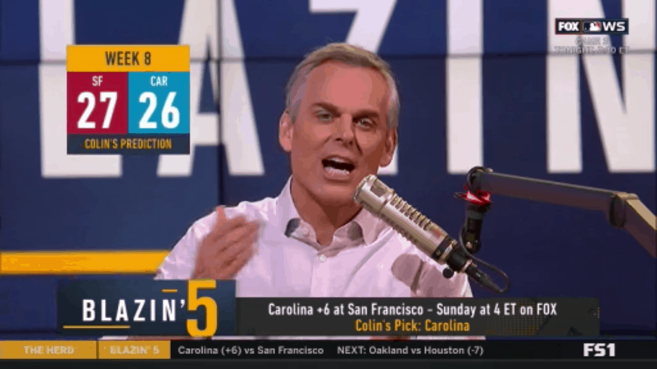Football | NFL Colin Cowherd Blazing Five NFL 2019 Week 8 Picks On Fox Sports ByGeorge October 26, 2019October 26, 2019 Carolina at San Francisco – Carolina (+6) More picks next page… Pages: 1 2 3 4 5 6
