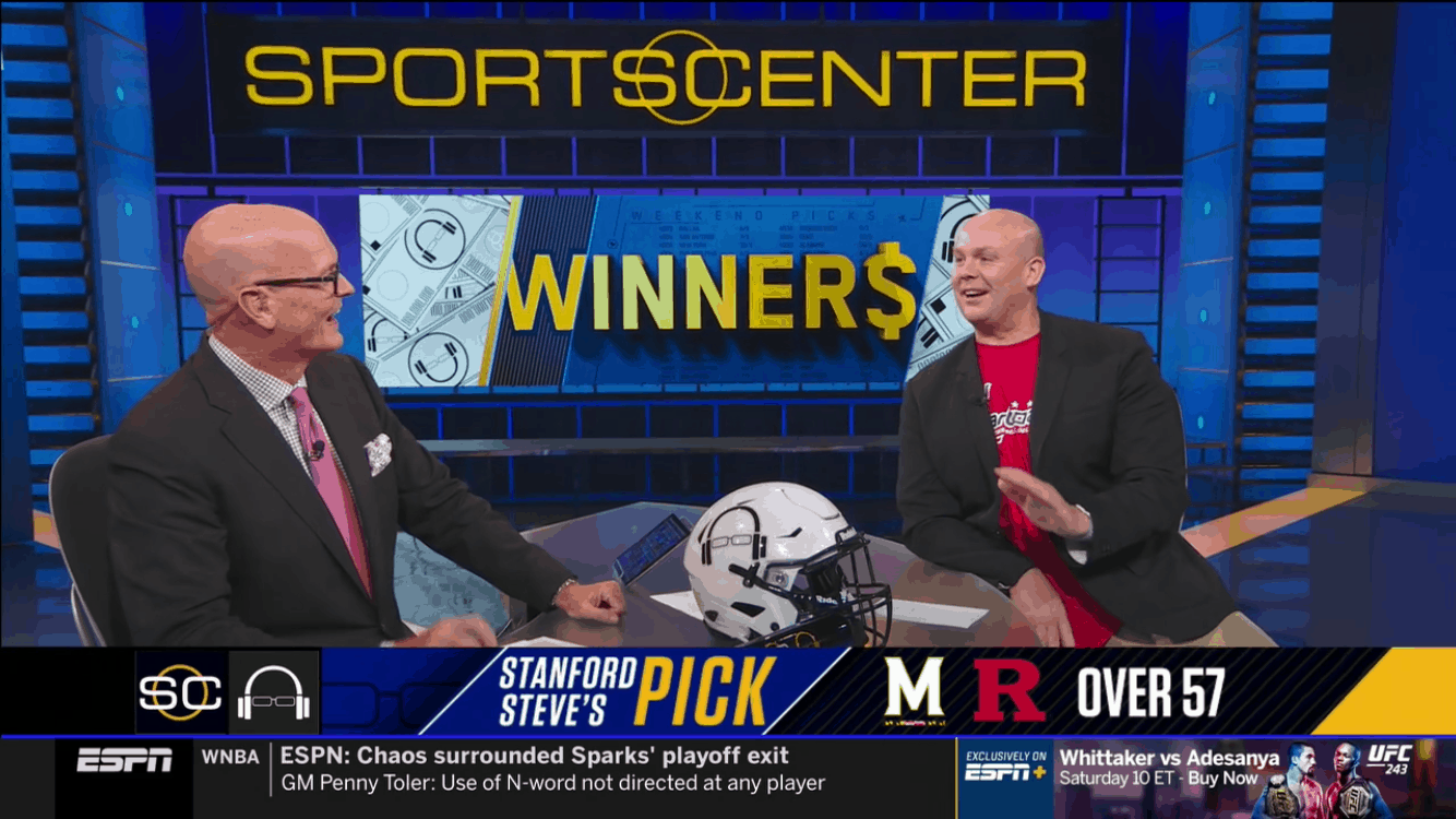 For those not familiar with Stanford Steve, he is SVP’s Sport Center sidekick. He usually makes his pick of the week on the show on Thursdays, which you can find below. He also hosts a podcast with The Bear. On the podcast he will typically make around 5 picks, which you can also find below. Good luck yall!